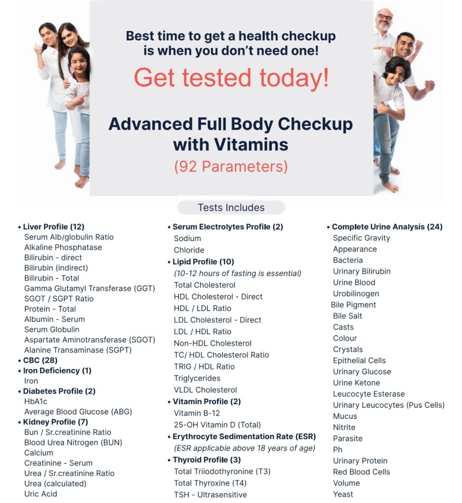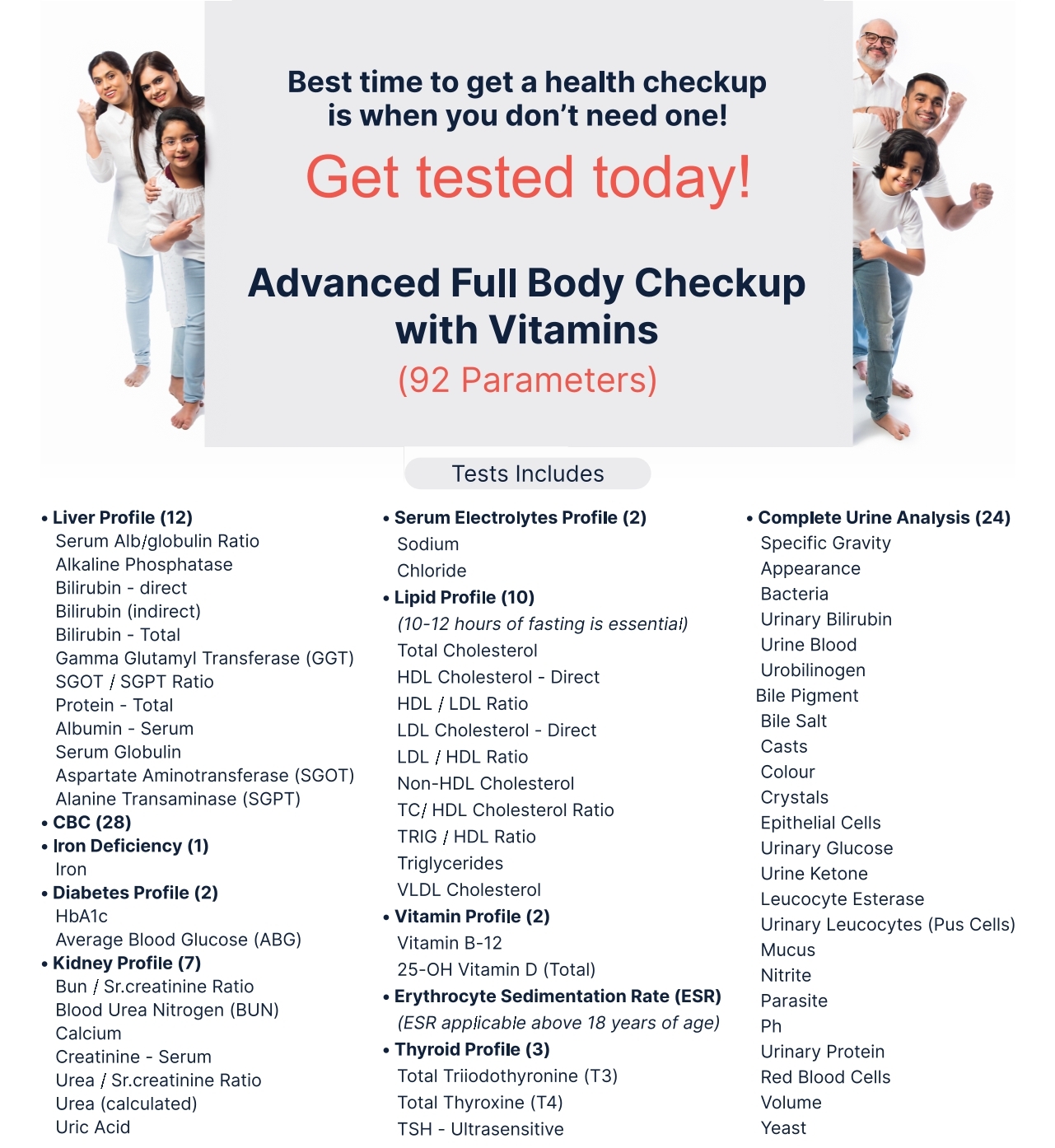 Advanced Full Body Checkup with Vitamins profile is a full-body preventive health checkup that gives you complete understanding of your bodily functions. The profile comprises 92 tests including Thyroid, Liver, Lipid and Kidney profiles, Iron deficiency, Serum Electrolytes, Complete Urine Analysis and more. Additional profiles like Diabetic Screening and CBC help you monitor sugar levels and potential blood infections. Vitamin D and B12 tests help measure vitamin levels. Book this profile at an affordable rate and get a FREE home sample collection.
